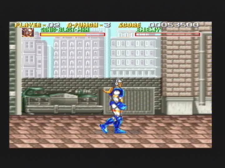 SONIC BLASTMAN is a video game produced by Taito for arcades and later ported to Super Nintendo Entertainment System.The Super NES version is a beat 'em up.Sonic Blastman must save the Earth from diverse kinds of evil forces,from street gangs and terrorists,to aliens and robots and finally,an evil clone of himself.The fight starts on a construction site in Earth and ends up in outer space.The game is only one player.The Japanese version had female enemies which were replaced by male ones in the American and European versions.The Pal version of Sonic Blastman is quite rare...