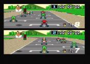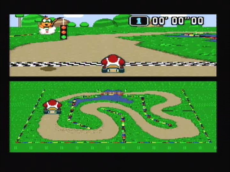 SUPER MARIO KART is the first video game in the Mario Kart series released in 1992 for the Super Nintendo Entertainment System.Players race go-karts as one of eight characters from the Super Mario series.It features advanced graphics for the time by the use of Mode 7 texture mapping.The game was produced by Shigeru Miyamoto and the music was composed by Soyo Oka and Taro Bando.Super Mario Kart can be played by one or two players.All gameplay uses a horizontal split screen view.In single player mode,the top screen displays the course while the bottom screen can either display a rear-view mirror perspective or an overhead view of the whole track,displaying where all the racers are currently.In multiplayer,the bottom screen is assigned to the second player's view.There are four cups in the game with five tracks each.Super Mario Kart is the third best-selling game on the SNES...